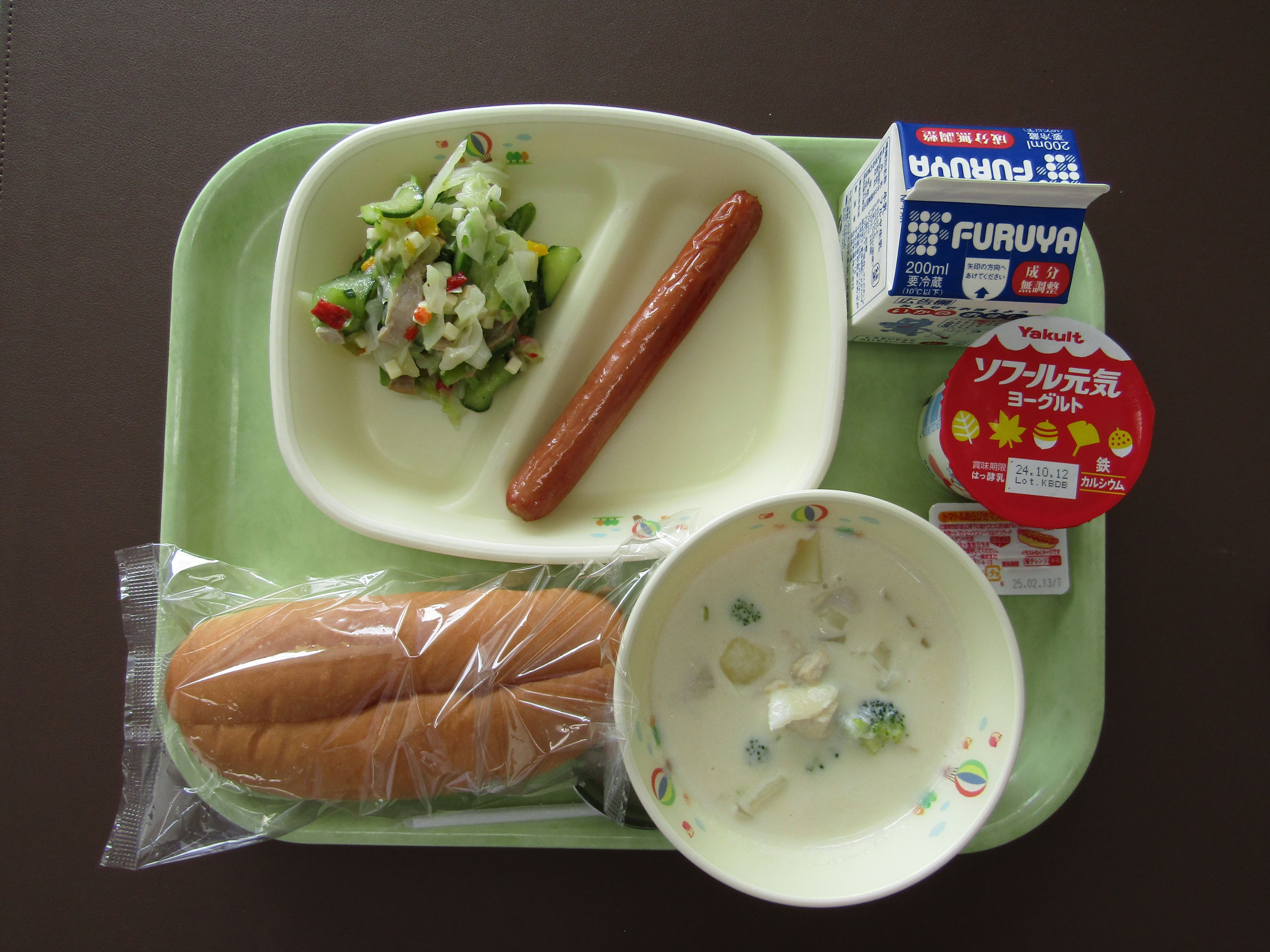 ④毎月1回実施している「鉄人給食」。「鉄人ソーセージ」は当給食センター用に地元業者と栄養教諭で共同開発しました。