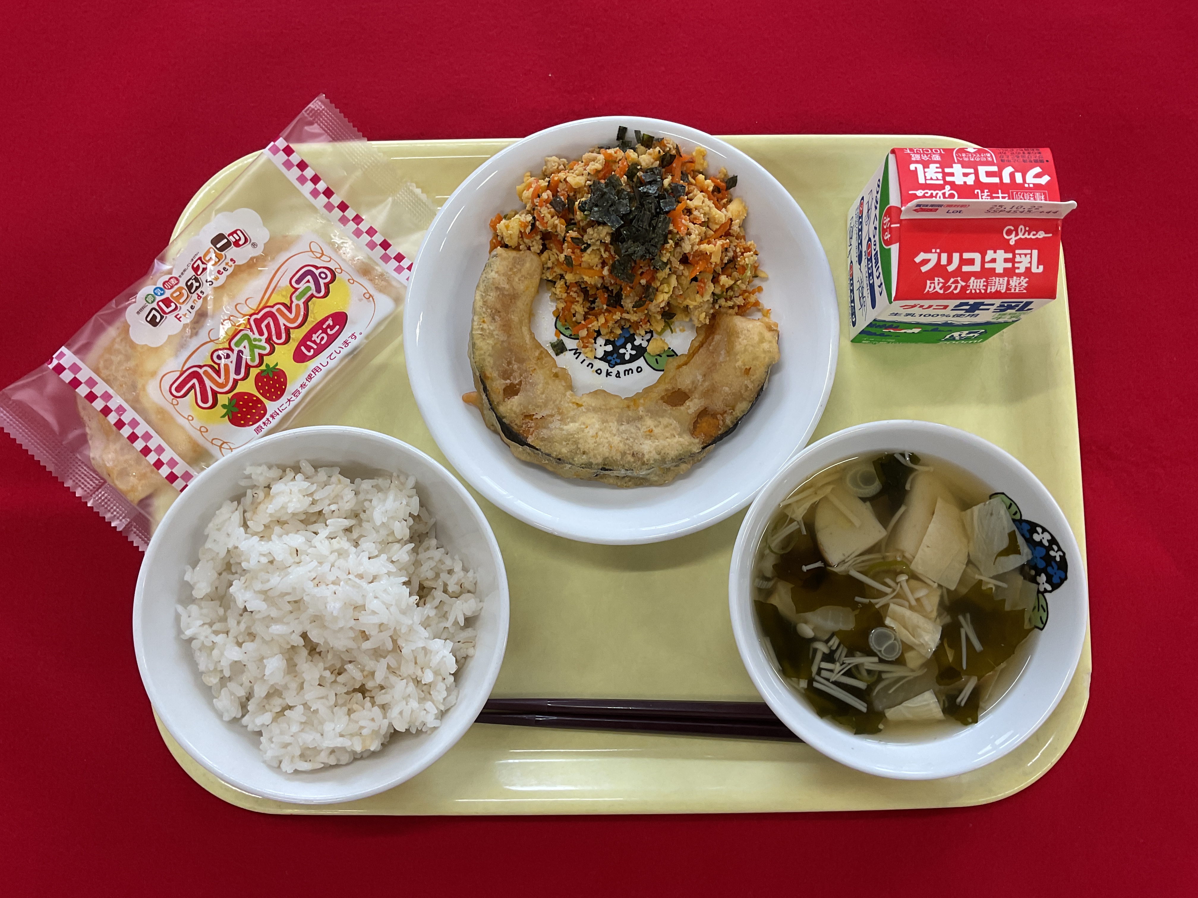 美濃加茂市の土はサラサラしていて水はけがよいため、さといも作りに適しています。この土壌を生かして生産されたさといもは粘りがあってやわらかく、郷土自慢の食べ物の一つです。主菜の「さといもとぶた肉の五平だれ」は、このさといもと地場産ぶた肉を油で揚げ、岐阜県の郷土料理である五平もちのような甘辛いたれを絡めました。ナッツアレルギーのある児童生徒も安全に食べられるよう、五平もちのたれに加えるくるみやピーナッツを使わず、ねりごまやはちみつで香ばしさやコクを出すよう工夫しています。「こまつなのたくあんあえ」には、県内の主要産地である神戸町産こまつなを使用。キャベツやもやし、千切りたくあんなどとあえました。「大豆の変身汁」は、小学3年生の国語「すがたをかえる大豆」と関連を意識して、県産の大豆から作られた豆腐・油揚げ・湯葉・えだまめ・豆乳・みその6種類の大豆加工品を使っています。「ごはん」は、市内で生産された岐阜県のブランド米「ハツシモ」です。