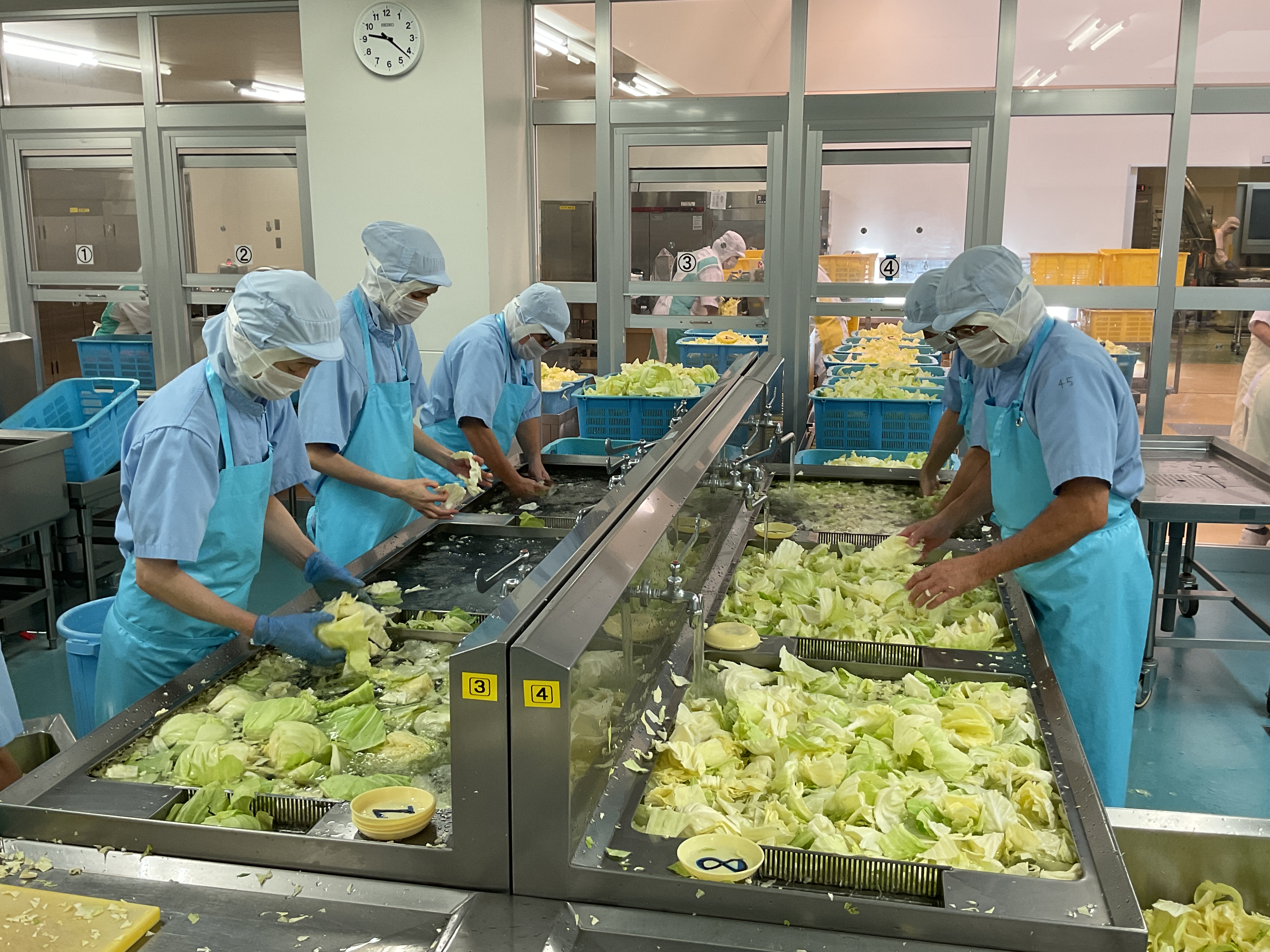 ③下処理でキャベツを洗う様子です。この日は370㎏のキャベツを使用しました。