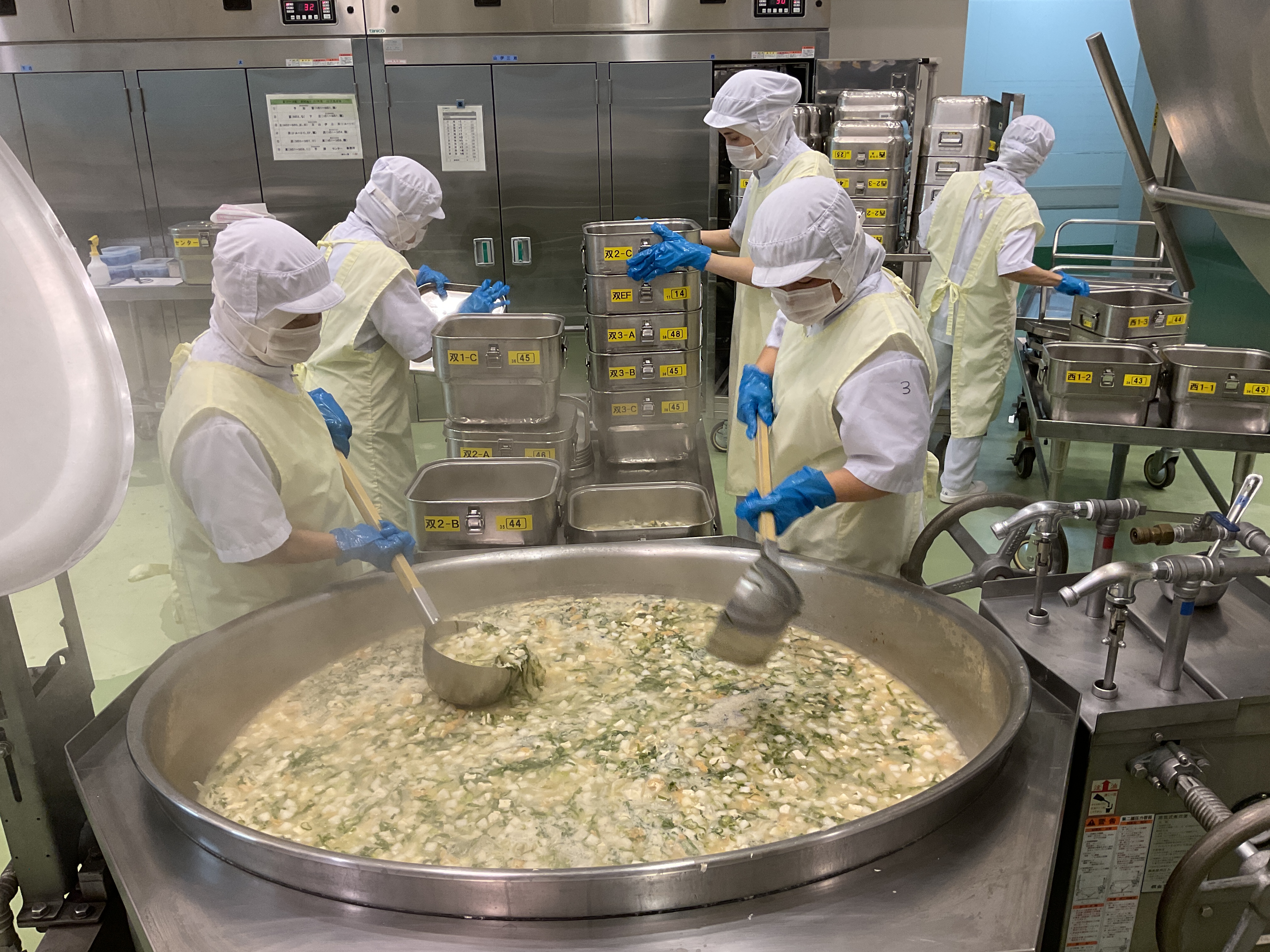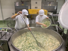 ⑦切干大根の煮物を作る様子です。一釜で約2000人分の汁物を作ります。味のムラがないように、二人でていねいに混ぜて、じっくりと煮ていきます。