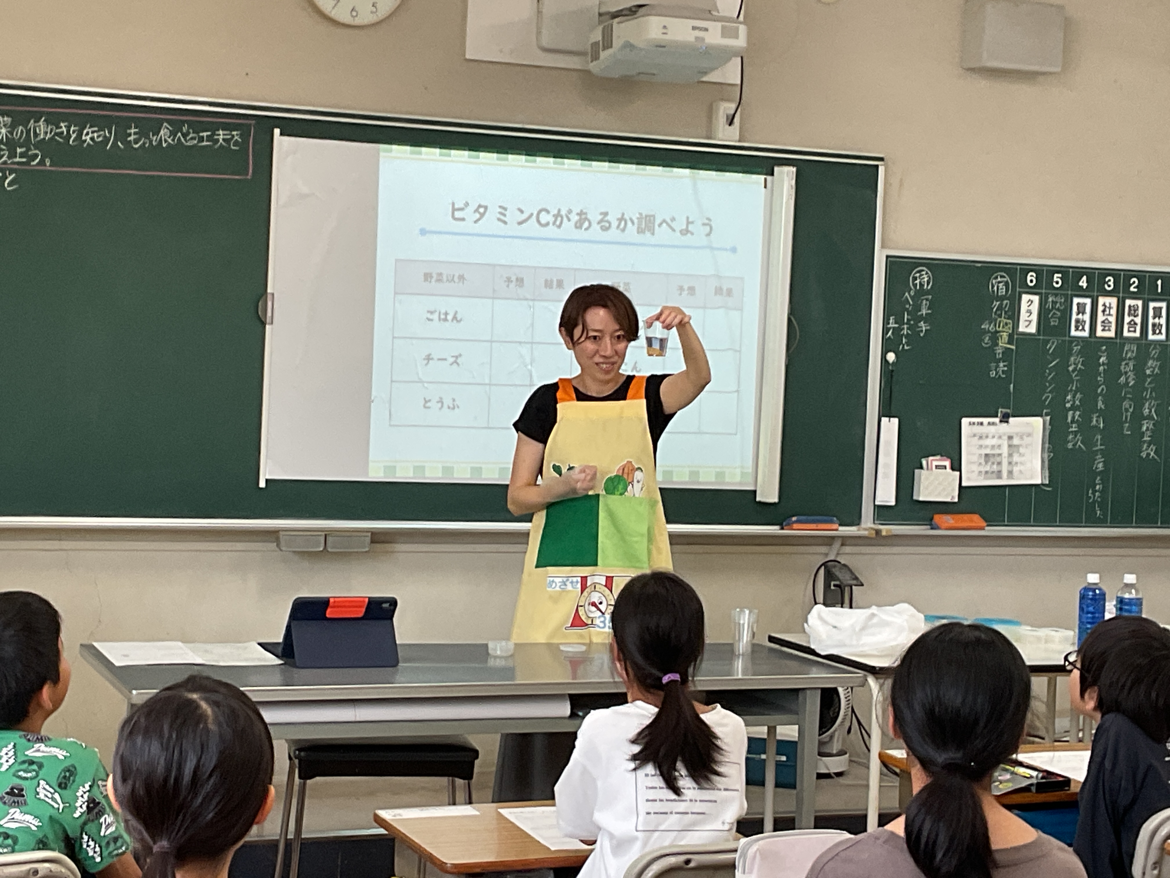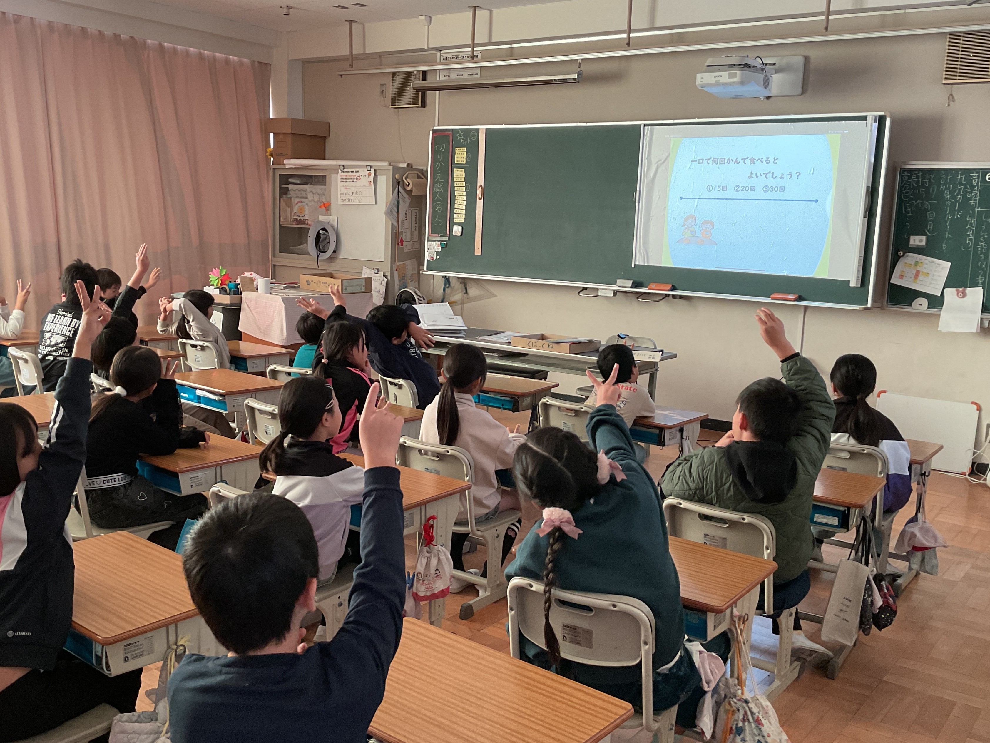 ⑧栄養教諭が行う学級活動での食育の様子です。楽しく学び、実践につながる食育を目指しています。