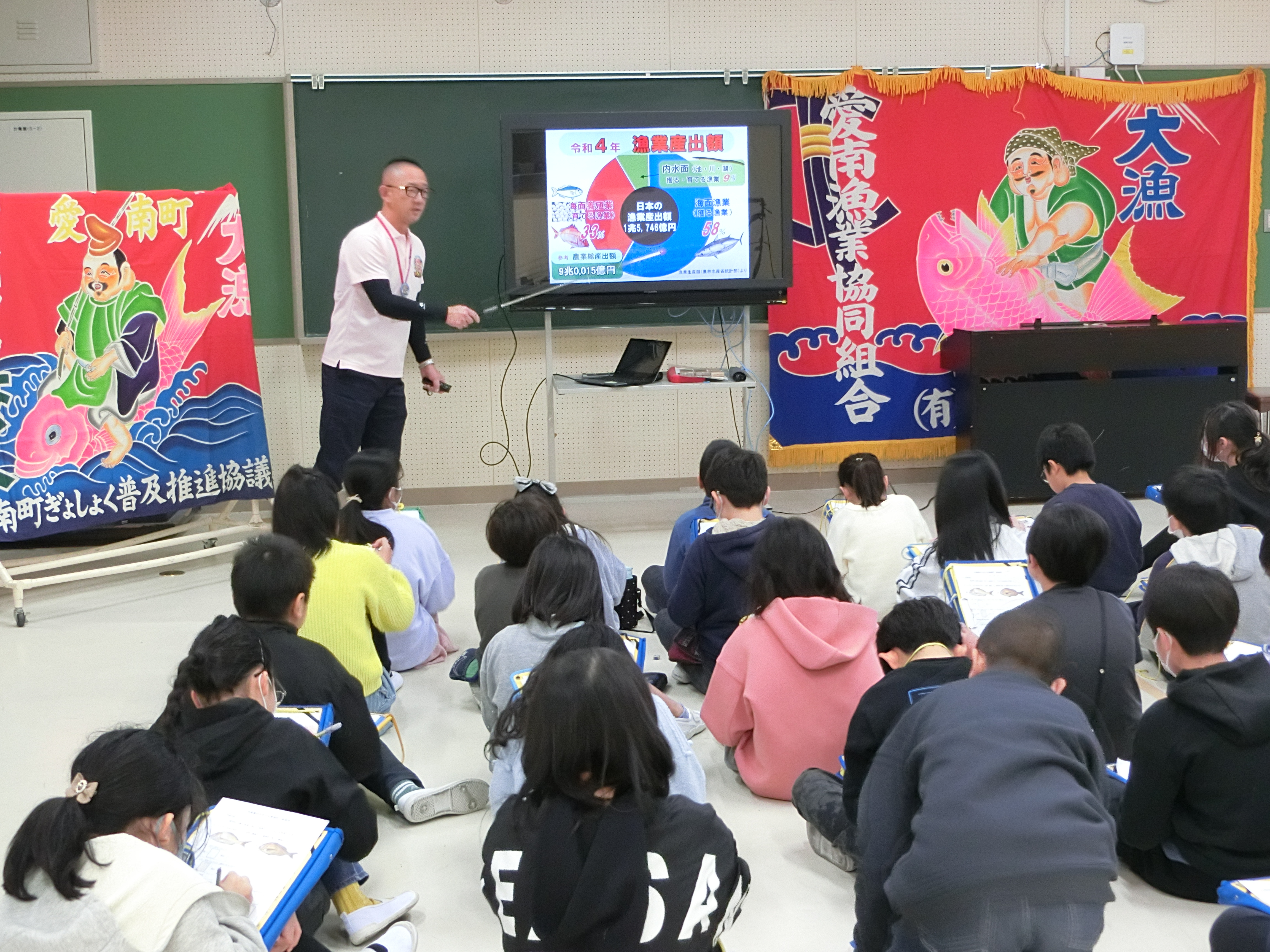 ⑨5年生は愛媛県愛南町の協力で、鯛の養殖、育てる漁業の学習。本物の大きな鯛を触って大盛り上がり