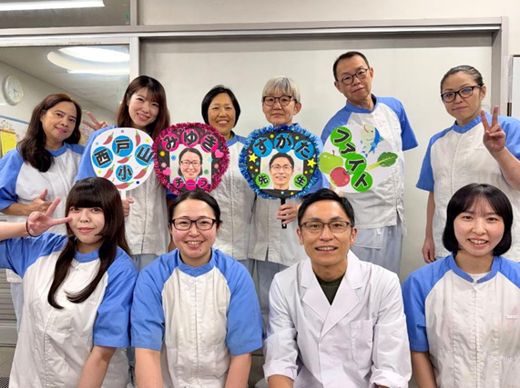 ①給食室のメンバーです。毎日力を合わせて頑張っています。