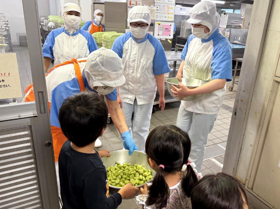 ②1年生がさやをむいたそら豆を受け取ります。おいしく料理するので、給食時間をお楽しみに。