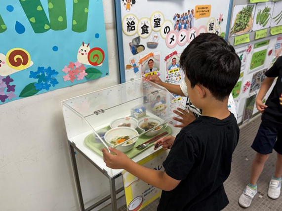 ⑥今日の給食は何かな?毎日、給食室の前でしっかりチェック。
