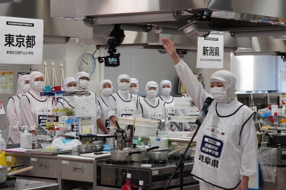 「宣誓。私たちはそれぞれの地域の特色を生かし、子どもたちの笑顔と健康につながるおいしい給食をつくります。第20回という記念すべき大会で、すてきな先生方といっしょに全力を尽くすことを誓います。令和7年12月7日、岐阜県代表、中島祐佳」