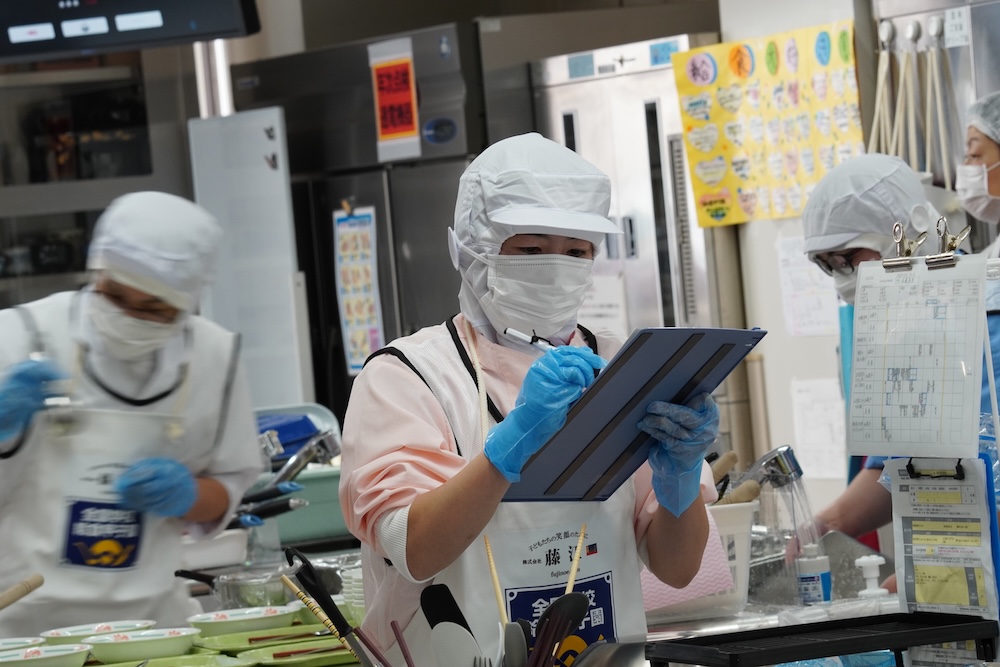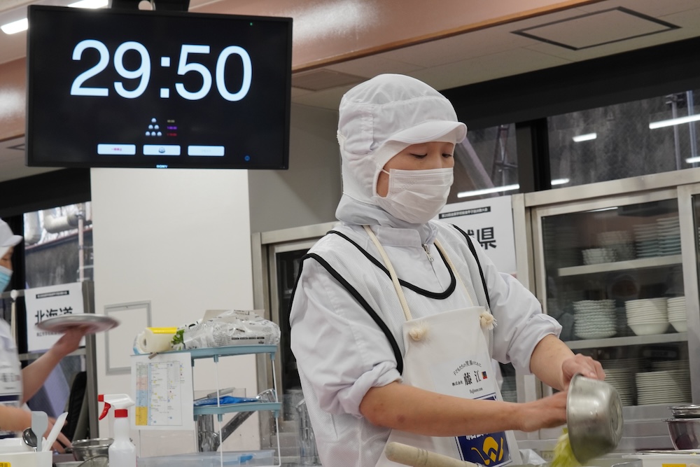 おいしく栄養バランスや見た目のよい料理を作るだけが勝負ではありません。衛生管理のありかたも、審査委員によって厳しく評価されます。学校給食の現場では、衛生状態なども厳しく問われ、選手たちは時折鍋の中や食材の中心にまで温度計を差し入れて温度チェックを行っていました。