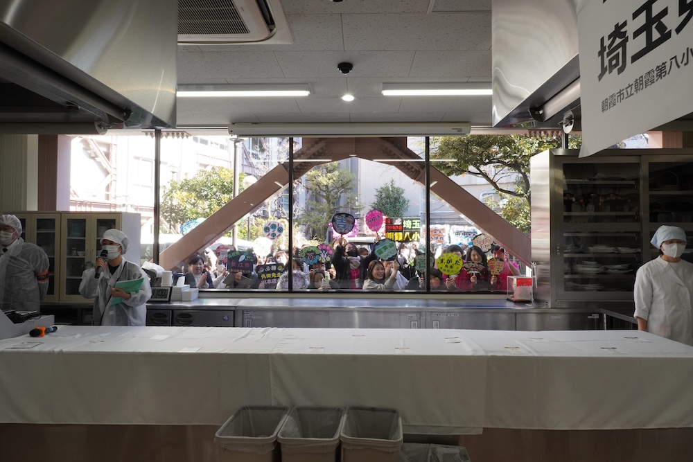 決勝の会場には、全国各地から参加校の応援団も集まりました。応援団は調理場に面した窓の外から、自校の選手に向けてデコレーションを施した団扇やパネルを振り、大きな声援を送っていました。岐阜県代表の中島祐佳選手が選手宣誓