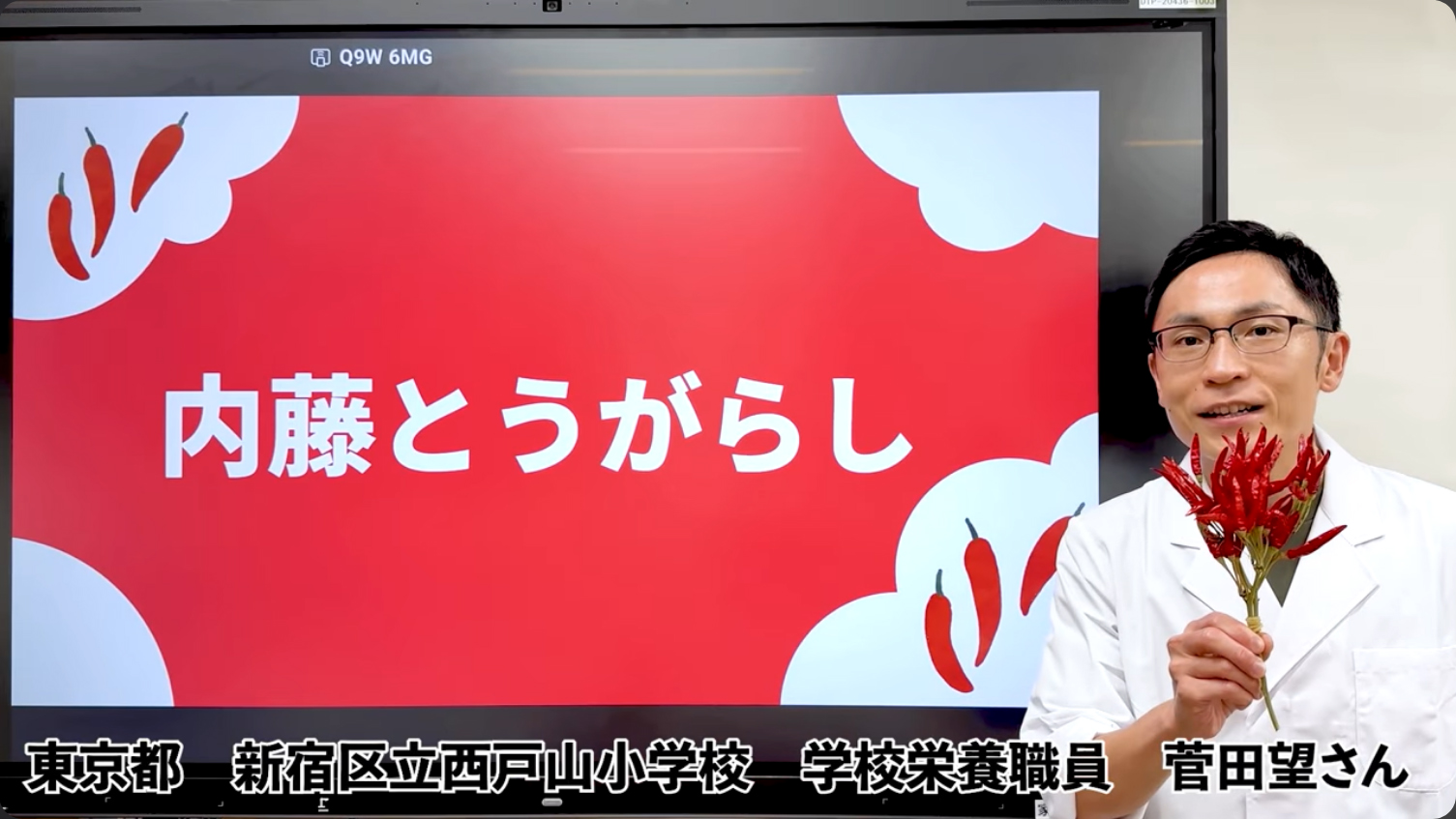 その中で大都会の歴史の変転の中からよみがえった唐辛子を食材に、子どもたちを引き込む授業を展開して見事、最優勝賞(キッコーマン賞)を獲得したのは、東京代表(東京都新宿区立西戸山小学校)の菅田望・学校栄養職員でした。男性栄養士が頂点に立ったのは初めてです。内藤とうがらしの歴史と江戸野菜