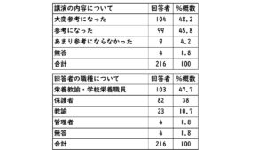 参加者からは、講演で得た知見を今後の食育活動、給食週間の取組、家庭での食生活の見直しに生かしたいという前向きな意見が多数寄せられた。