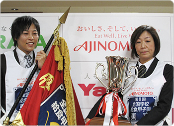 2,266校の頂点、優勝(味の素株式会社 だし・うま味賞)に輝いたのは、東京都代表・文京区立青柳小学校の学校栄養職員 松丸奨さん、調理員 大野雅代さん。