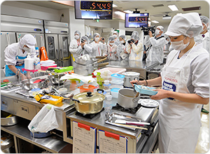 時間内の盛りつけはもちろんのこと、洗い物も全て済ませて、開始前と同様の整然とした調理台にしなくてはならない。