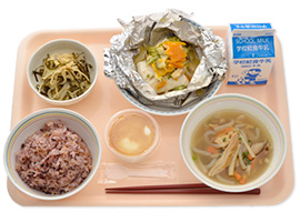 | 献立名 | もちきび黒紫米ごはん、 牛乳、 イラブチャーのホイル蒸し、 クーブイリチィー、 中身汁、 波照間黒蜜とろ〜りヨーグルトゼリー |