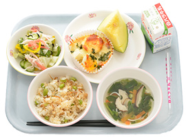 | 献立名 | 枝豆じゃこご飯、 牛乳、 長芋豆乳グラタン、 らっきょうサラダ、 椎茸茶のすまし汁、 メロン |