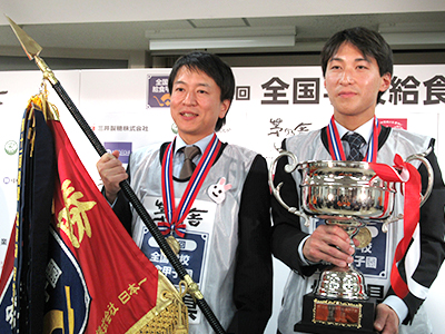 第12回全国学校給食甲子園®決勝大会(主催:特定非営利活動法人 21世紀構想研究会、後援:文部科学省・農林水産省など)が12月3日、東京都豊島区駒込の女子栄養大学駒込キャンパスで開かれ、男性ペアの埼玉県越生町立越生小学校チーム(栄養教諭・小林洋介さん、調理員・三好景一さん)が優勝(久原本家グループ本社賞)の栄冠に輝きました。栄養教諭、調理員ともに男性のペアで出場し、優勝したのは史上初めてです。