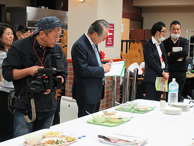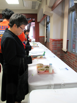 調理中の審査が終わると、別室で食味審査に移ります。完成した12の給食の見た目から審査していきます。料理は目で食べるといわれるように見た目も大切です。一つ一つ評点を付けながら見ていきます。