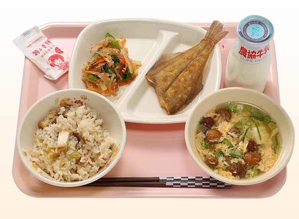 | 献立名 | あぶらげと富津金時のごはん、牛乳、赤がれいの唐揚げ、福井野菜の五目あえ、かきたまみそ汁、羽二重もち |