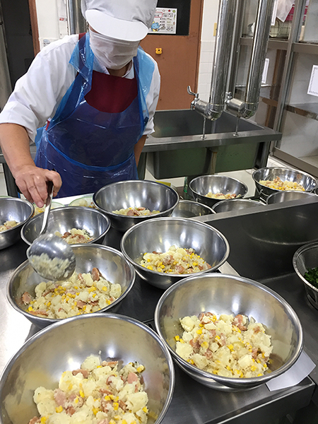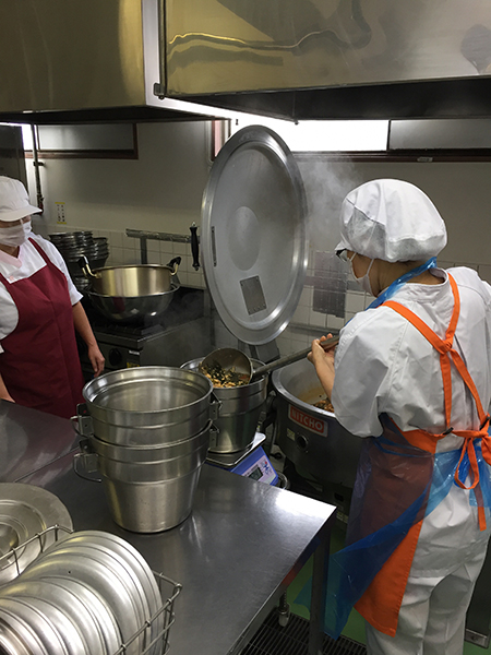 相馬市は海の幸、山の幸に恵まれている豊かな土地です。試験操業中ですが、現在184種の魚介類が水揚げされており、その中で、給食では、カルシウムが豊富な小魚をよく利用しています。今回は「野菜のじゃこあえ」に使用しました。松川浦では青のりの生産が盛んで、来年から地青のりの水揚げが再開される予定です。昔から食べられてきたあおのりと相馬市内で作られたねぎ、豆腐を取り入れ「あおのりのみそ汁」としました。「牛肉のスタミナ炒め」の牛肉は、相馬市・南相馬市のブランド牛、相馬牛を使用します。おいしい牛肉を、市内で作られた野菜、隣の新地町で作られたりんごと一緒に炒め、市のコシヒカリのご飯が進むおかずにしました。