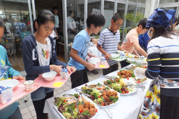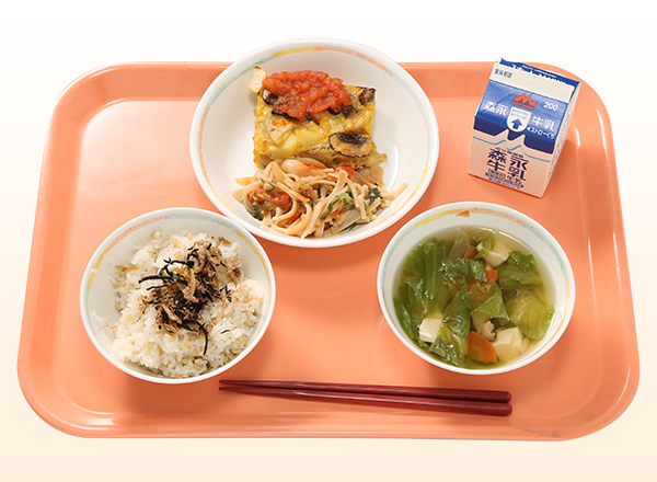 | 献立名 | もち麦入りご飯+レモン入りふりかけ、牛乳、根菜ゴロゴロオムレツ+淡路のトマトソース、もち麦麺のイタリアンソース、レタスのスープ |