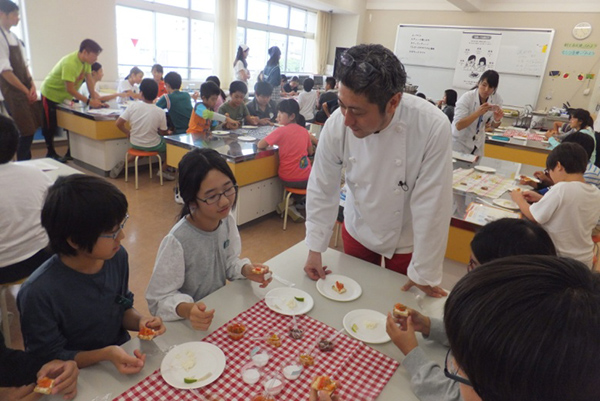 応募した献立は、地産地消週間に登場したものです。芦屋市は地場産物が全くありませんので、地産地消の地域を兵庫県に広げ、取組んでいます。昨年は淡路の産物を給食に使い、「ええもん うまいもん淡路 ~御食国ミッケ~」と題し、淡路産品のPRもをしました。そのおかげで新しい納入業者が開発され、淡路産品を安定して使用できる環境が整いました。淡路のレモンは、ちりめんレモンふりかけに皮の部分、果汁はイタリアンソースに使用しました。淡路島の食糧自給率は107%で、漁業も酪農も盛んです。たまねぎや様々な産品を給食に使うことができて、ありがたいです。今回のトマトソースを作ったパッサータも、淡路の業者が加工して冷凍保管しているものです。もち麦入りごはんと、もち麦麺のイタリアンソースは、意図的に同じ日に提供しました。福崎町の特産のもち麦で作った「もち麦麺」を使います。麺には、ばち(ばち状の切れ端)を使っています。価格が少し安く、長さも給食にむくのでとても重宝しています。乾ししいたけやマッシュルームなどのきのこは兵庫県産品で、大いに活用しています。
