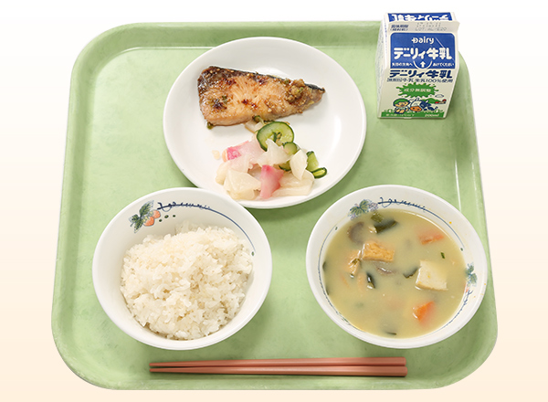 | 献立名 | 麦ごはん、牛乳、地場産ぶりのねぎ塩焼き、かぶの黒酢あえ、豆豆みそ汁 |