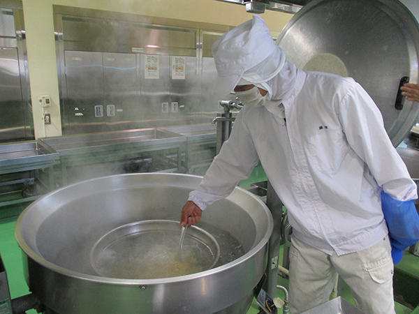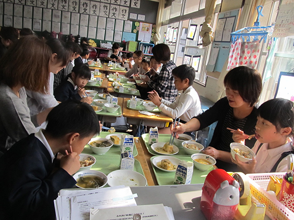 「地場産ぶりのねぎ塩焼き」は市の特産のぶりを使用します。本市は鹿児島のぶり養殖発祥の地です。当給食センターでは、毎月10日を「垂水いお(鹿児島の方言で魚のこと)の日」として、地元のぶり、かんぱちを提供しています。「かぶの黒酢あえ」には、かぶときゅうりを使用しました。どちらも地元の生産者グループの品です。「豆豆みそ汁」は、豆をしっかり食べてほしいとの願いをこめて作った一品です。この中にも地場産野菜を使用し、地元の農産加工グループが作る麦みそで仕上げています。