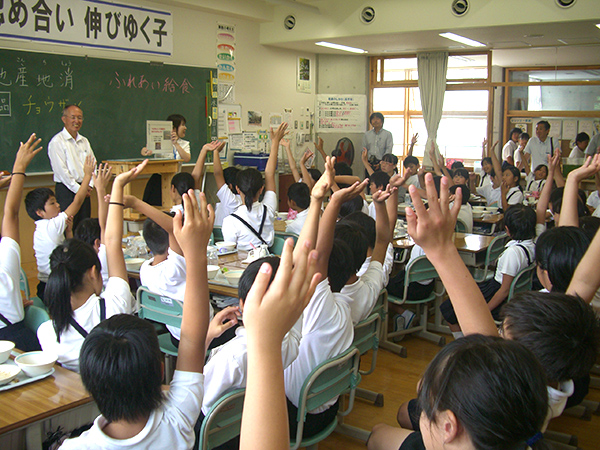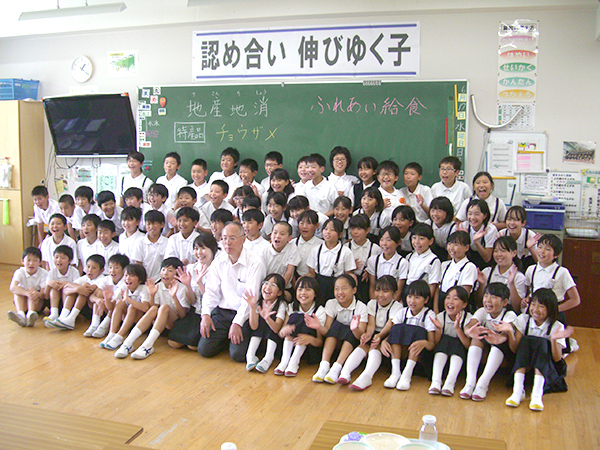 食育月間の取り組みで「チョウザメ」を使った給食を実施し、養殖されている方を小学校にお招きし「ふれあい給食」を行いました。食べた後は手作り紙芝居「ちょうざめものがたり」を子どもたちに読み聞かせました。