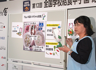 給食でも減塩の施設をしています。打ち豆は、大豆を潰すことで旨味が出てるので塩を抑えられ、旬の地場産野菜は甘みと旨味が強く薄味でもおいしく食べられるということを子どもたちに伝えました。