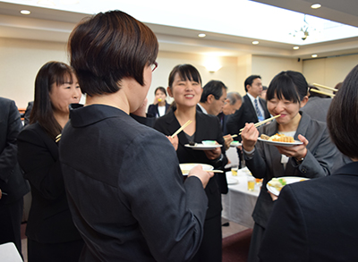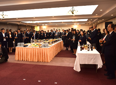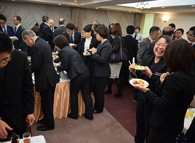 前夜祭レセプションのハイライトは決勝大会に出場する選手と関係者らの懇談です。香川明夫・香川栄養学園理事長・女子栄養大学学長の乾杯の発声で始まった懇談の場は、例年を超える約200人の参加者で溢れました。会場は例年通り、徳川光圀公が命名したという由緒ある同大のレストラン「松柏軒」です。