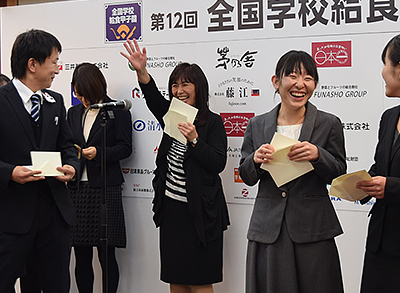最後は3日の開会式で行われる選手宣誓のくじ引き。引き当てたのは、愛媛県西条市立神拝小学校の栄養教諭、武方美由紀さんでしたが、何と息子さんが2013年の第8回大会で決勝に進出、「牛乳・乳製品部門賞」を受賞していたのです。「息子に負けるわけにはいきません」と武方さん。熱い決勝になりそうです。